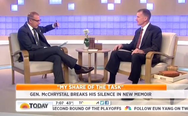 MATT LAUER: Retired General Stanley McChrystal was the top U.S. commander in Afghanistan three years ago. He resigned after a controversial profile in Rolling Stone magazine in which he and his advisers were quoted making some disparaging comments about the President and key administration officials. Now General McChrystal is breaking his silence about that and some other things in his new memoir, it's called My Share of the Task. General, it's always good to see you, good morning. Nice to have you here.