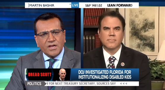 MARTIN BASHIR: Congressman, Governor Scott has repeatedly turned down the offer of federal funds that would allow parents to care for their disabled children at home. Now, in the interest of transparency, we cared for my own disabled brother at home until he died. But in a letter from the Department of Justice it says, Florida, and I'm quoting, "has planned structured and administered a system of care that has led to the unnecessary separation and isolation of hundreds of children in nursing facilities." Congressman, what kind of person is it that chooses to target the most defenseless and weakest members of our society?