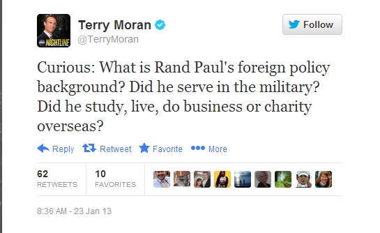 Nightline co-anchor Terry Moran lashed out at Rand Paul on Twitter, deriding the senator for daring to bluntly question Hillary Clinton over her role in the Benghazi scandal. Moran mocked, "Curious: What is Rand Paul's foreign policy background? Did he serve in the military? Did he study, live, do business or charity overseas?"