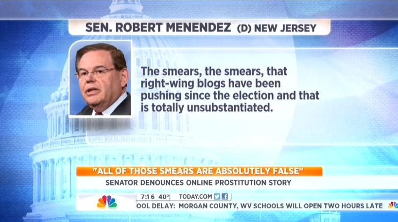 NBC Touts Menendez Dismissing Prostitute Scandal as 'False Attack' From 'Political Enemies'