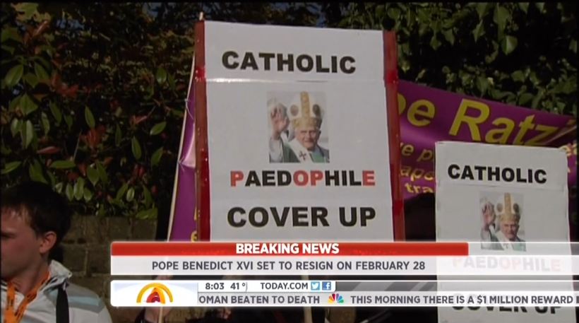 [FOOTAGE ON SCREEN OF PROTEST SIGNS WITH POPE'S PICTURE READING: "CATHOLIC PAEDOPHILE COVER UP"]