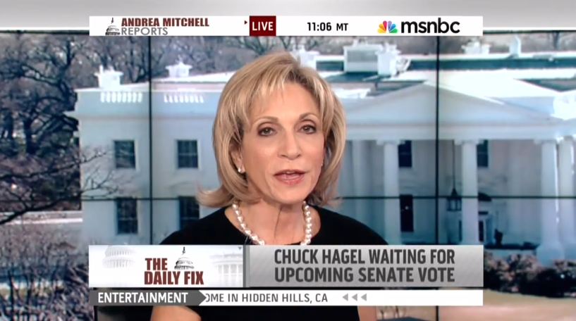 On her 1 p.m. et hour MSNBC show on Thursday, host Andrea Mitchell mounted her high horse in condemning Republican senators who questioned defense secretary nominee Chuck Hagel about his connection to what turned out to be a fake organization: "Without even checking the factual basis for their questions....You can ask anything and create a sound bite, and then people pick it up in social media, and it's off and running." [Listen to the audio or watch the video after the jump]