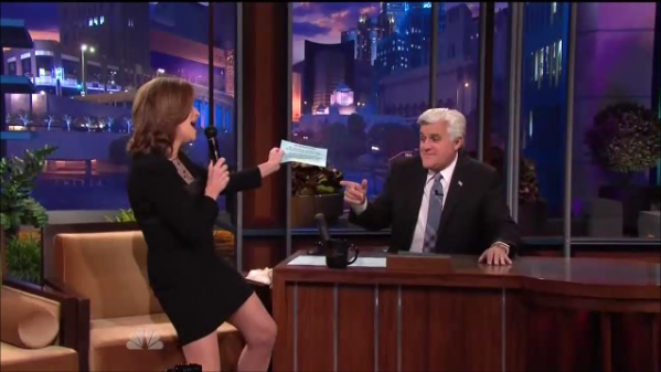In the middle of the interview, Leno brought up that Seth MacFarlane is hosting Sunday’s Academy Awards. He commented that she could host such a program.