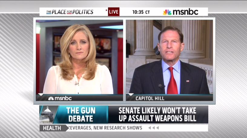 Well, yesterday, Senate Majority Leader Harry Reid told reporters he'd scrapped California Democrat Dianne Feinstein's assault weapons ban for lack of votes. The Nevada Democrat noted he only had at most 40 votes out of 53 Democrats and two Democrat-caucusing independents. In other words, Republican votes are a non-factor, since the Democratic caucus is hardly sold on the idea to begin with. Yet the very next day, MSNBC’s Alex Witt allowed Senator Richard Blumenthal (D-Conn.) to essentially blame the GOP and the NRA for the setback to the Left on gun control. [See video after jump. MP3 audio here.]