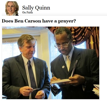 Maybe we should take to ironically nicknaming Sally Quinn as "Scoop" for this: On March 27, in a column headlined "Does Ben Carson Have a Prayer?" the Washington Post On Faith editor attacked Dr. Ben Carson for his National Prayer Breakfast speech delivered on February 7. That's 48 days between the speech and Quinn's holding forth on why Carson, in her view, improperly politicized a characteristically apolitical prayer breakfast.