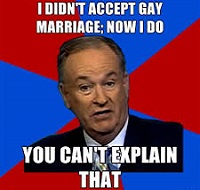 What so-called conservatives like O'Reilly must realize is that without the moral authority of our Creator, one can take a man marrying another man or a man marrying a few men or a mother marrying her adult son or a man marrying a woman and a man, etc. and put all of these on the same intellectual footing. Even Obama knew he had to appeal to divine authority when he was pretending to be against homosexual marriage.
