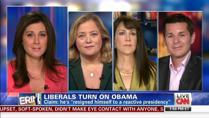 At the beginning of the segment, Burnett had quoted liberal columnists Maureen Dowd of the New York Times and Dana Milbank of the Washington Post wishing Obama to more aggressively pursue his liberal plans, in what she termed as "liberals turning on President Obama." It was enough to merit one of the five main stories on her show OutFront.