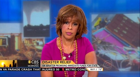 On Wednesday's CBS This Morning, open Obama supporter Gayle King strongly hinted to Oklahoma Senator Tom Coburn that he would face voter backlash for seeking cuts in the federal budget to pay for tornado disaster relief: "You voted against relief plans for Hurricane Sandy, and it sounds that you would do the same if it was raised in Oklahoma. Do you worry about alienating your constituents?"