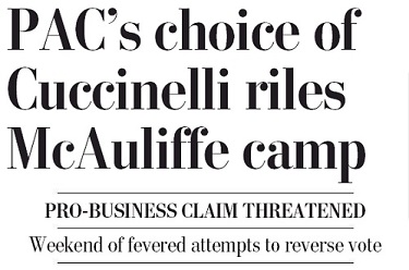 In the digital edition, the headline was similar, "McAuliffe camp erupts over business PAC’s choice of Cuccinelli for Virginia governor."