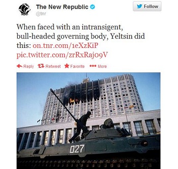 On Tuesday, Julia Ioffe, senior editor for the liberal New Republic publication, all but suggested that President Obama needed to use military force against Tea Party conservatives in Congress. Ioffe likened the current federal government shutdown to the 1993 constitutional crisis in Russia, where then-President Boris Yeltsin ultimately ended the impasse by dissolving the parliament, and had tanks shell the legislative body's "White House".