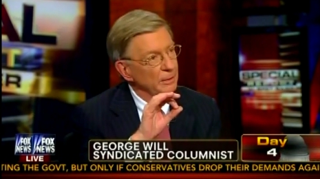 In his first comments on the network, Will said on Friday's Special Report, "The President’s rather enjoying this [shutdown], and if the emblematic statement of the first Obama term was 'A crisis is a terrible thing to waste,' this term defined after just nine months is 'A crisis is a beautiful thing to create'” (video follows with transcript and commentary):