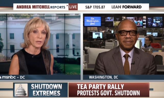 At the top of her 1 p.m. ET hour MSNBC show on Monday, host Andrea Mitchell wrung her hands over "angry Tea Party protesters" who gathered in Washington over the weekend to denounce the Obama administration's politicization of the government shutdown being "whipped up" Sarah Palin and Texas Senator Ted Cruz. [Listen to the audio or watch the video after the jump]