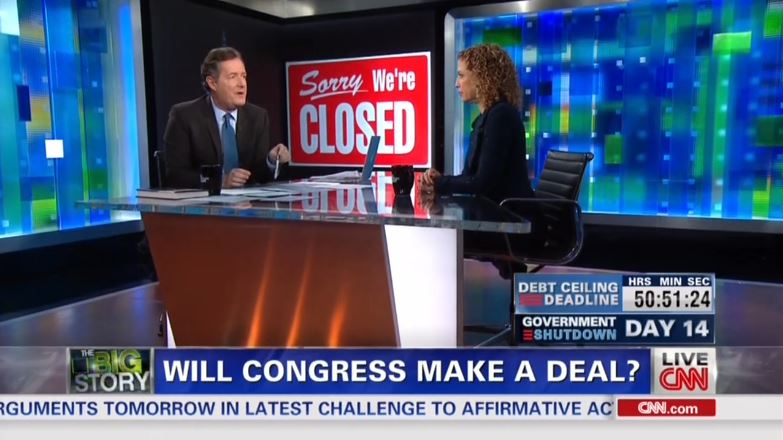 Morgan's first question to Rep. Debbie Wasserman Schultz (D-Fla.) was this pathetic softball: "What is going on with the GOP right now?" Schultz laid into her political opponents. "They have the opportunity to do the right thing and not shut the government down and hold the economy hostage with the Affordable Care Act as ransom. And instead they went with the Tea Party," she ranted. [Video below the break. Audio here.]