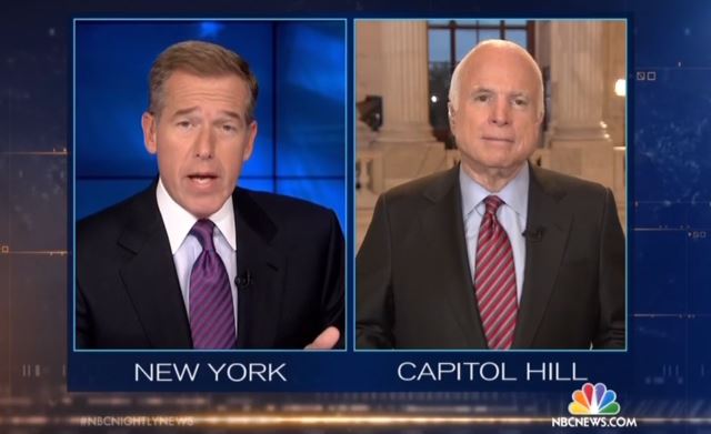 As the government shutdown was nearing it's end Wednesday evening, NBC Nightly News anchor Brian Williams conducted a live interview with John McCain, urging the Arizona Senator to slam fellow Republicans over the budget showdown: "Senator, let's talk about the damage in order, to the country, to your party, your profession, and how much of this do you lay at the feet of Senator Cruz from Texas?" [Listen to the audio or watch the video after the jump]