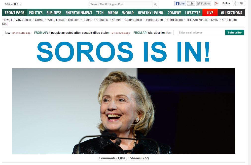 To give a good measure of the Soros move, the liberal Huffington Post led its front page with the headline: “SOROS IS IN!” immediately following the announcement.