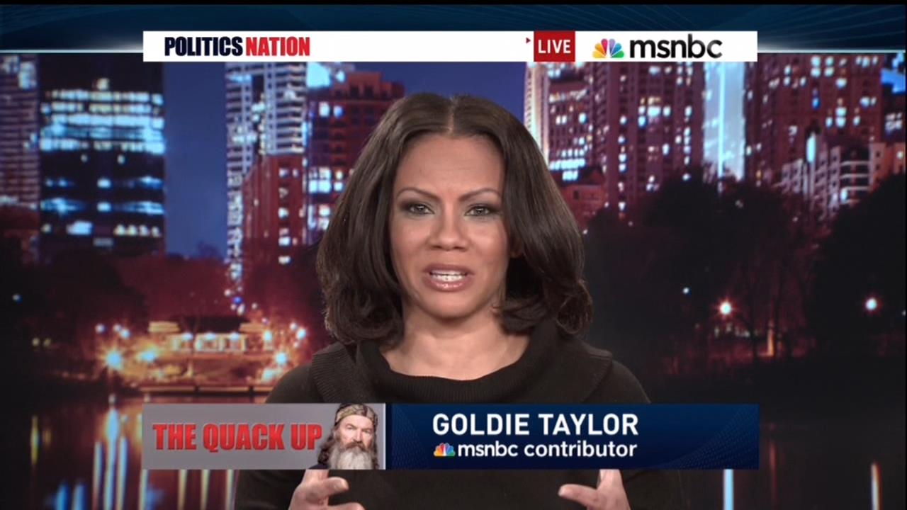 SHARPTON: Excuse me? That's not what all Christians believe. And it's time for conservatives to stop using religion to justify mean spirited attacks. Joining me now are Goldie Taylor and Jimmy Williams. Thank you both for your time tonight. ... Goldie, let me rush to you. These right wingers really want homophobia and Duck Dynasty to be the new face of the GOP?