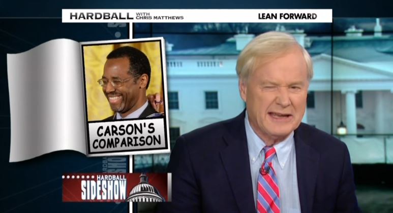 The liberal Chris Matthews on Monday night mocked Ben Carson for comparing the progressive movement to Nazis. However, Matthews isn't in a position to judge. He has repeatedly connected conservatives to Nazis. The cable host played a clip of the Fox News commentator at a fund-raising event for senatorial candidate Monica Wehby.