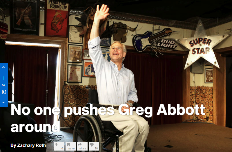 Even when attempting to say something nice about a conservative, MSNBC somehow managed to stick its foot in its mouth. Resident MSNBC.com voter-ID conspiracy theorist Zachary Roth sickeningly blared in a March 5th piece that “No One Pushes Greg Abbott Around” with an accompanying picture of Mr. Abbott waiving to supporters from his wheelchair.