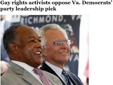 To its credit, the Washington Post this morning is reporting an intramural spat roiling inside the Democratic Party in the Old Dominion. Turns out gay rights groups are livid that Gov. Terry McAuliffe (D-Va.) has nominated Richmond Mayor Dwight Jones to chair the state's Democratic Party. Jones, who happens to be African-American and is a Baptist pastor, "has not endorsed same-sex marriage," the Post's Laura Vozzella noted, even though he has a strong record on other issues of import to the gay-rights movement.
