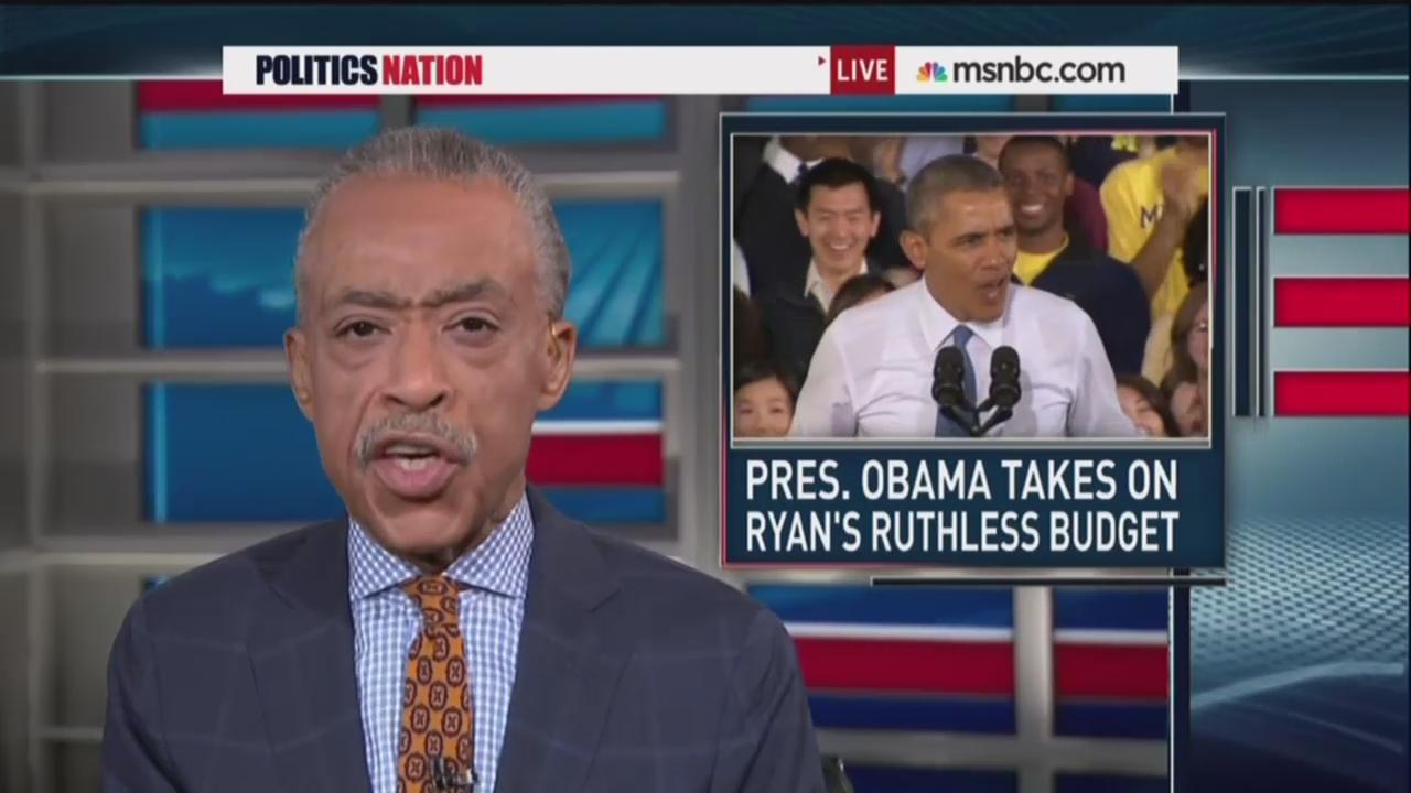 AL SHARPTON: Tonight's lead, the president slams Congressman Ryan's ruthless budget. In a blistering speech today President Obama blasted the GOP's new budget and its skewed vision of this country, one where the rich benefit at the expense of everyone else.