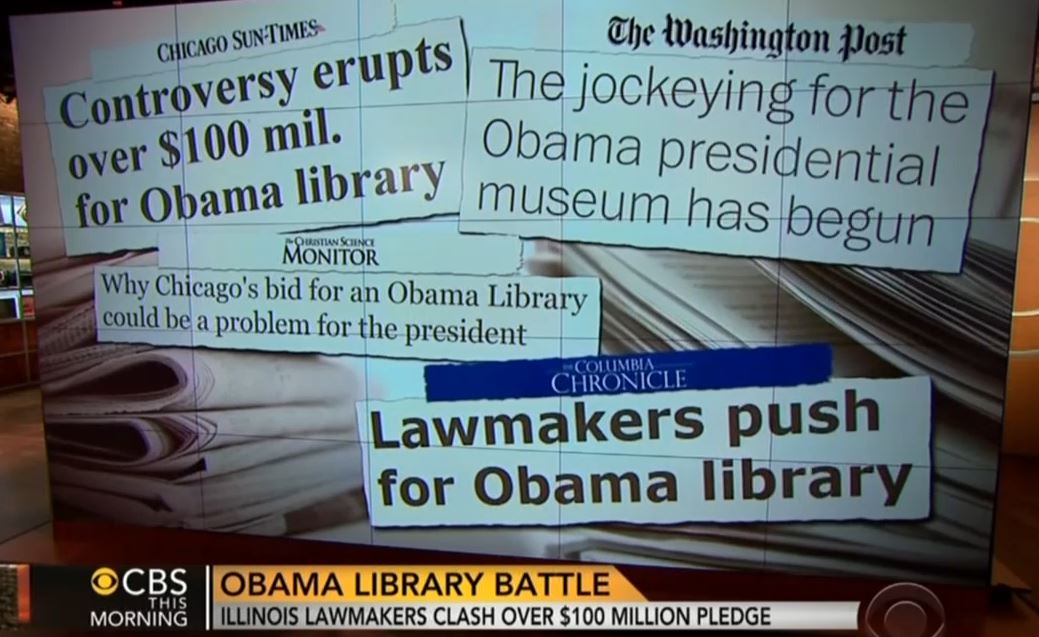 This Morning co-host Norah O'Donnell noted the proposed massive spending was "a controversial move for a state that's pretty deep in debt." Correspondent Nancy Cordes explained: "That's right, $7 billion in debt. But Democrats in Illinois say allocating this money will help to convince the Obama Foundation to locate the Obama Library in Chicago, while many Republicans argue the President's hometown is the front-runner anyway and that this is an expense their state can't afford." [Listen to the audio or watch the video after the jump]