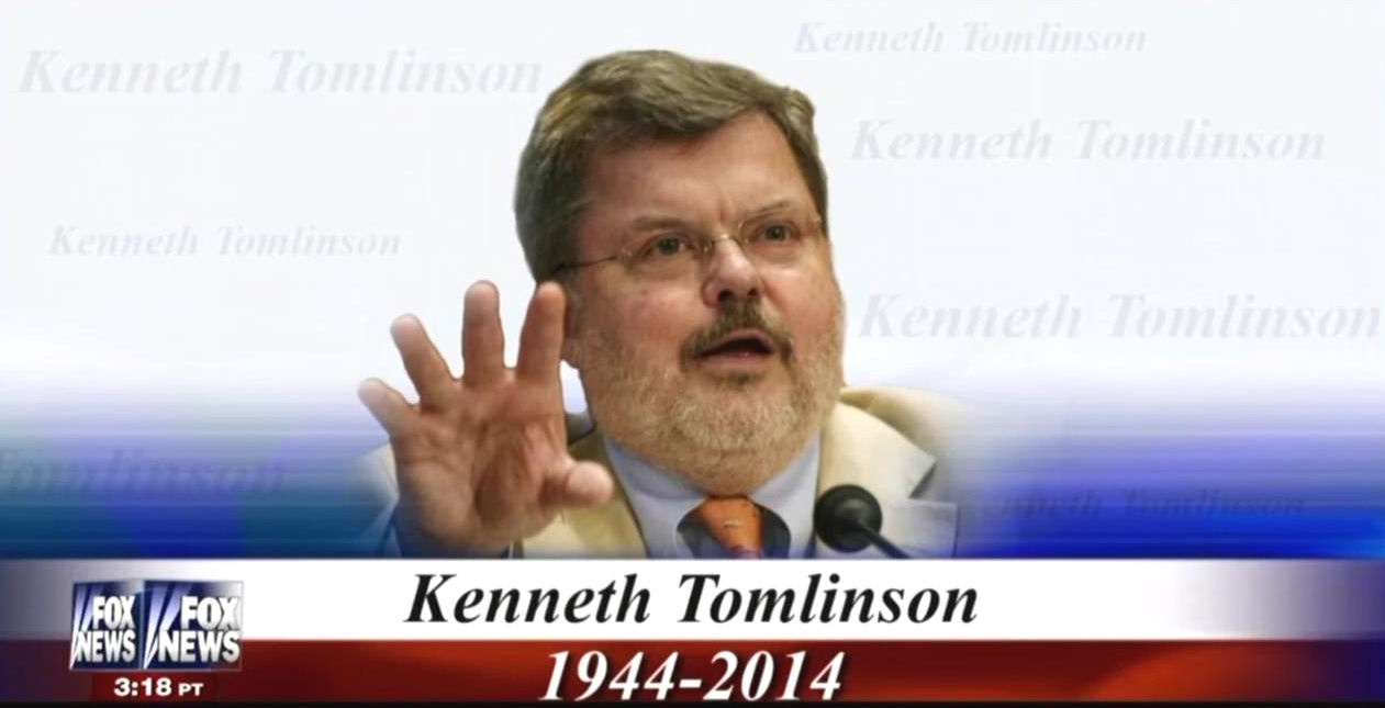 Fox News anchor Bret Baier reported the death on Friday night: Former Readers Digest and Voice of America chief, Kenneth Tomlinson died last night at a Virginia hospital. Tomlinson had been hospitalized for several days. He was appointed to run VOA by President Ronald Reagan in 1982. His son Lucas is a "Fox News" producer. He was 69. Our condolences go out to Lucas and his family."