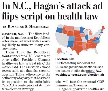 Tuesday, May 6 is primary day for the North Carolina race for U.S. Senate, and The Washington Post ran a misleading front-page story declaring “In N.C., Hagan’s attack ad flips script on health law.”