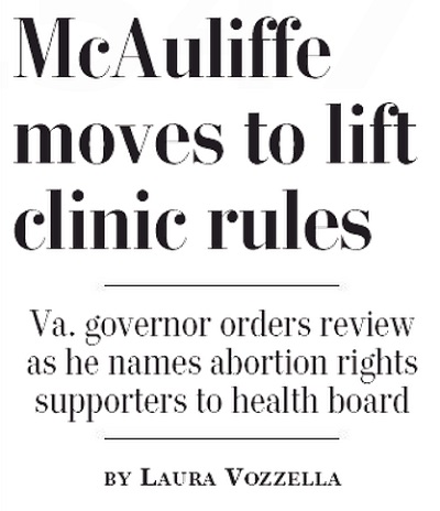 Vozzella didn't get around to the objections of McAuliffe's critics until the ninth paragraph of her Tuesday, May 13 front-pager, "McAuliffe moves to lift clinic rules." What's more, she buried in the 23rd paragraph -- of a 30-paragraph story -- the fact that "McAuliffe, elected with help from abortion rights groups, [has] made no pretense of ignoring the litmus test [for his new appointees to the state Board of Health], stating flatly that his appointees reflected his views." What's more, it wasn't until paragraph 27 that Vozzella noticed that (emphasis mine):