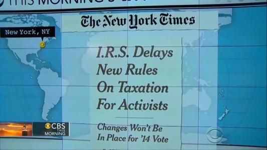 The major news, announced on Thursday, that the IRS is going back to the drawing board on proposed rules that would’ve regulated political activity for groups like the Tea Party was ignored by two of the Big Three (ABC, CBS, NBC) networks. Only CBS, on Friday’s CBS This Morning, covered the agency’s backtracking in a 19-second Charlie Rose brief.
