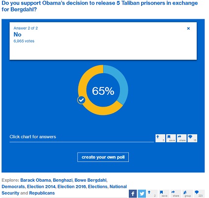 By a nearly 2-to-1 margin (65 percent), readers answered "no" to the poll question, "Do you support Obama’s decision to release 5 Taliban prisoners in exchange for Bergdahl?" You can see the screen capture taken at 9:09 p.m. Eastern below the page break