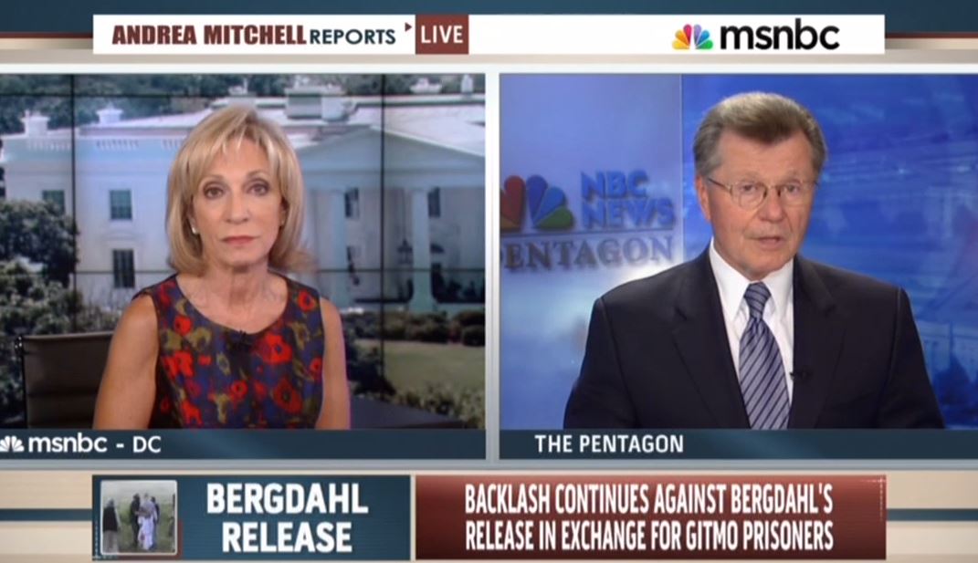 Such critical analysis was prompted by host Andrea Mitchell wondering: "Were they [at the Pentagon] at least, were they somewhat taken aback, as the White House was, by the controversy that erupted over this?" Miklaszewski replied: "Not at all....senior defense and military officials were aware from the very beginning, shortly after he was – disappeared from his base five years ago, that this was a controversial issue. That soldiers were upset that one of their own would abandon their post in a war zone..."