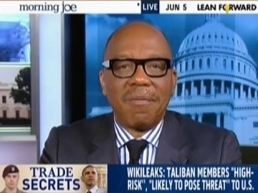 How else to explain his mind-boggling claim on today's Morning Joe that the impact on the war of the release of five senior Taliban officials would likely be "negligible." Incredibly, Robinson was only willing to put "senior" in skeptical air quotes [see screengrab after jump]. The WaPo columnist's claim sparked controlled outrage from Joe Scarborough, and energetic disagreement even from former Obama car czar Steve Rattner. View the video after the jump.