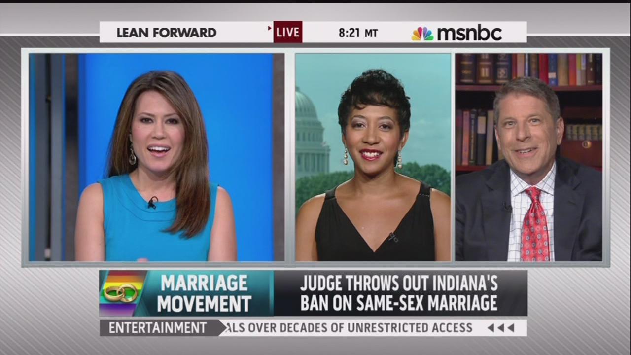 During MSNBC Live’s coverage on Thursday of the newest circuit and appeal court decisions to overrule bans on same sex marriage in Utah and Indiana, former CBS This Morning correspondent Betty Nguyen gave platform to Democratic strategist and chair of the Gay and Lesbian Victory Fund Steven Elmendorf and  Aisha Moodie-Mills, a senior fellow at the Center for American Progress. No conservative voices were heard.
