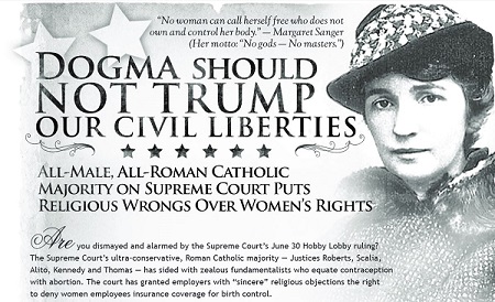 The 2012 ad from FFRF was more explicitly anti-Catholic than their more recent one (see image at right). The atheist group called on "liberal" and "nominal" Catholics to "quit the Catholic Church" over its supposed "declaration of war against women's right to contraception" and its "pernicious doctrine that birth control is a sin." The ad later asserted that "U.S. health care reform is being held hostage to...[the] church's irrational opposition to medically prescribed contraception" and that parochial schools "indoctrinated....[children] into the next generation of obedient donors and voters." It ended by calling on Catholics to "free yourself from incense-fogged ritual, from ideas uttered long ago by ignorant men, from blind obedience to an illusory religious authority."