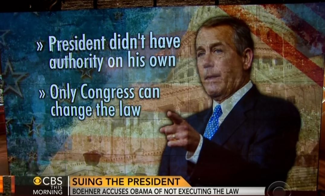 On Friday, only CBS This Morning covered the latest developments on House Speaker John Boehner's lawsuit against President Obama over a 2013 executive order delaying the ObamaCare employer mandate. [Listen to the audio or watch the video after the jump] NBC's Today and ABC's Good Morning America completely ignored Boehner's office releasing the House resolution to sue the President.