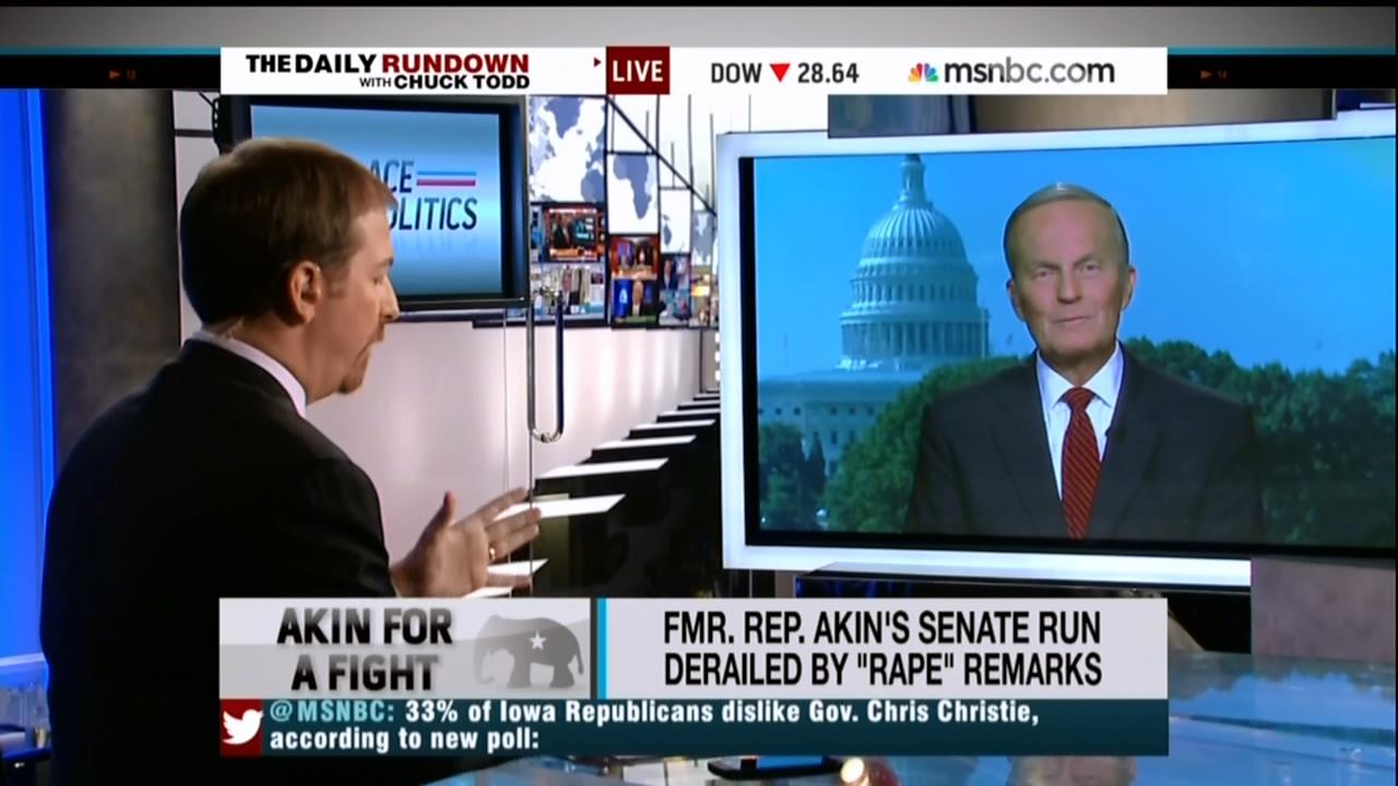 Former congressman Todd Akin took his book tour to Chuck Todd's MSNBC show The Daily Rundown on Thursday morning. That came after a pretty rough Megyn Kelly interview on Monday night about the 2012 media feeding frenzy over his medically incorrect remarks about women's bodies often shutting down if there's a "legitimate rape."