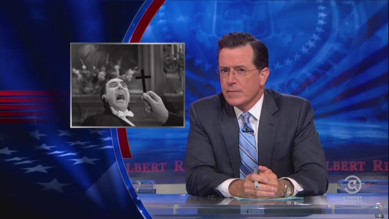 As Colbert’s faux conservative personality expressed his outrage over the “transparent Hollywood attack on Republicans” in HBO’s latest episode of the explicit vampire series True Blood, he joked “we should not be surprised at all that vampires are Democrats. After all, they scream when they see a cross.” (See video below)