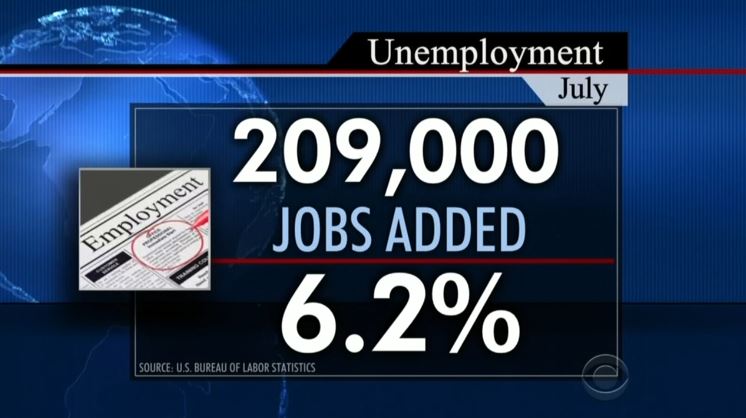 Released on Friday morning, the latest jobs report from the Labor Department touted a net growth of 209,000 jobs in July. On Friday evening, the report was promoted on all three of the major broadcast networks, ranging from news briefs by ABC and NBC to a full report from CBS. While there was plenty of praise and even an ounce of positive news, the networks mostly failed to note that the economy still has a long way to go.