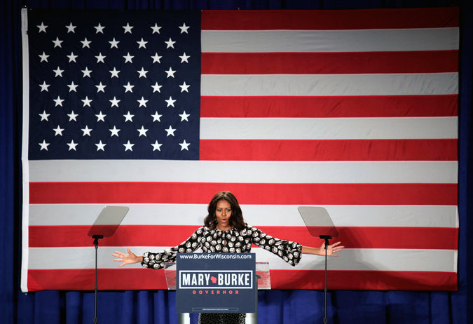 Last month, when Mrs. Obama was in Atlanta for the voter-registration rally with Ms. Nunn, the first lady held an educational event where she praised the wife of Georgia’s Republican governor, Nathan Deal, a top Democratic target. In Milwaukee, Mrs. Obama never said the name of Ms. Burke’s rival, Gov. Scott Walker, confining her remarks to affirmative reasons to elect Ms. Burke.