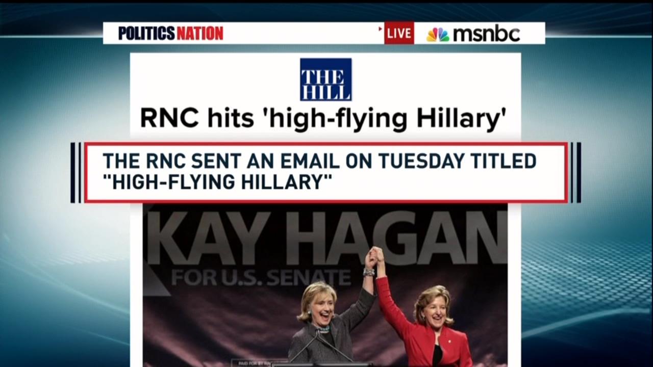 AL SHARPTON: We start with the Democrat who's fast becoming the hyper-focus of GOP attacks. Hillary Clinton. And now The Hill is reporting the Republican National Committee is on the offense again. The RNC has sent out an email titled "High-flying Hillary," hitting her for travel expenses for election-year campaign events, in an attempt to make the potential 2016 contender appear out of touch with voters . . . Chris, is this just player-hating on big public figures?