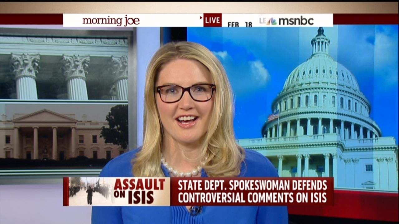 Latest dispatch from President Obama's Department of Terrible Deeds in the Name of Christ . . . Morning Joe invited State Department spox Marie Harf on today to give her a chance to clarify what she said to Chris Matthews about the US being unable to "kill our way" out of the ISIS problem and the need to focus on the "root causes" of terrorism. Morning Joe invited the State Department spox on today to give her a chance to clarify what she said to Chris Matthews about the US being unable to "kill our way" out of the ISIS problem and the need to focus on the "root causes" of terrorism.