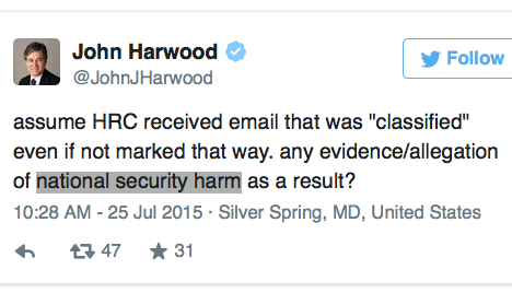 So now the standard of conduct for the person who wants to the be the next president of the United States is whether her illegal possession of classified (not in quotes, John) material generated during her service as the nation's top diplomat did any harm?