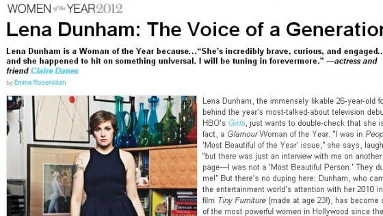 Lena Dunham, famous for her awful sex scenes and pro-Obama ad which likened voting to losing your virginity is being hailed as one of Glamour magazine’s “Women of the Year.”