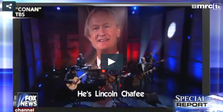 TBS’s Conan commissioned a song on behalf of Rhode Island’s leading candidate for President, Democrat Lincoln Chafee. FNC’s Special Report with Bret Baier made a clip of that parody song, “Let’s Get Lincoln Chafee to One Percent!” its end of show kicker this past Monday night where fill-in host Shannon Bream facetiously pleaded: “One percent. You want a man to have a fighting chance.”