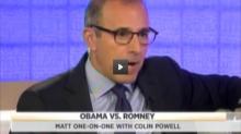 On Tuesday's NBC Today, co-host Matt Lauer pleaded with former Secretary of State Colin Powell to again endorse Barack Obama for president: "...it sounds like you're on his [Obama's] team still, four years later....why hesitate at this stage of the game here? I mean, it's basically Barack Obama vs. Mitt Romney. Why not just come out right now and throw your weight behind somebody?" [Listen to the audio or watch the video after the jump]