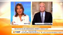 Continuing to attack Mitt Romney's reaction to the embassy attacks in Egypt and Libya, on Thursday's NBC Today, co-host Savannah Guthrie urged Senator John McCain to admit Romney made a mistake: "Was it correct for Mitt Romney to seize on that political opportunity at a moment when the U.S. Ambassador had been killed?" [Listen to the audio or watch the video after the jump]
