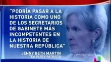 On Univision, correspondent Lourdes Meluzá ran a clip of Rep. Ileana Ros-Lehtinen (R-Fla.), who noted that Sebelius has been the principle face of “the disaster that has been, is and will continue to be ObamaCare.” Even more noteworthy, Univision’s report also featured Tea Party Patriots President Jenny Beth Martin, who called ObamaCare the former Secretary’s “legacy of shame” and said Sebelius “could go down in history as one of the most incompetent Cabinet secretaries in the history of the Republic."
