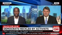 On Wednesday's CNN Newsroom with Carol Costello, during a discussion of the Democratic presidential debate, liberal CNN political analyst Marc Lamont Hill defended Bernie Sanders' socialist views and griped about Hillary Clinton apparently taking a jab at the Vermont Senator as the CNN analyst complained that "she's playing to people's insecurities and fears," and "play[ing] to the cheap seats."