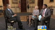 Strahan continued, "And there's been calls for resignations and Shinseki... says he's not going to resign. Do you think that he should and if he doesn't, would you be inclined to remove him?" (Just hours after the interview aired, Eric Shinseki quit as head of the VA.) Obama first shifted topics, insisting, "Well, let me first say that the greatest honor I have is serving as commander in chief."