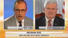 During his two previous interviews of Gingrich on the morning newscast, Rose threw the race card at the Republican for a supposedly insensitive remark about food stamps, and hammered him over prominent conservatives opposing his presidential campaign. The anchor also highlighted how apparently "there are those who say that you [Gingrich] are angry and you want to get even with Romney."